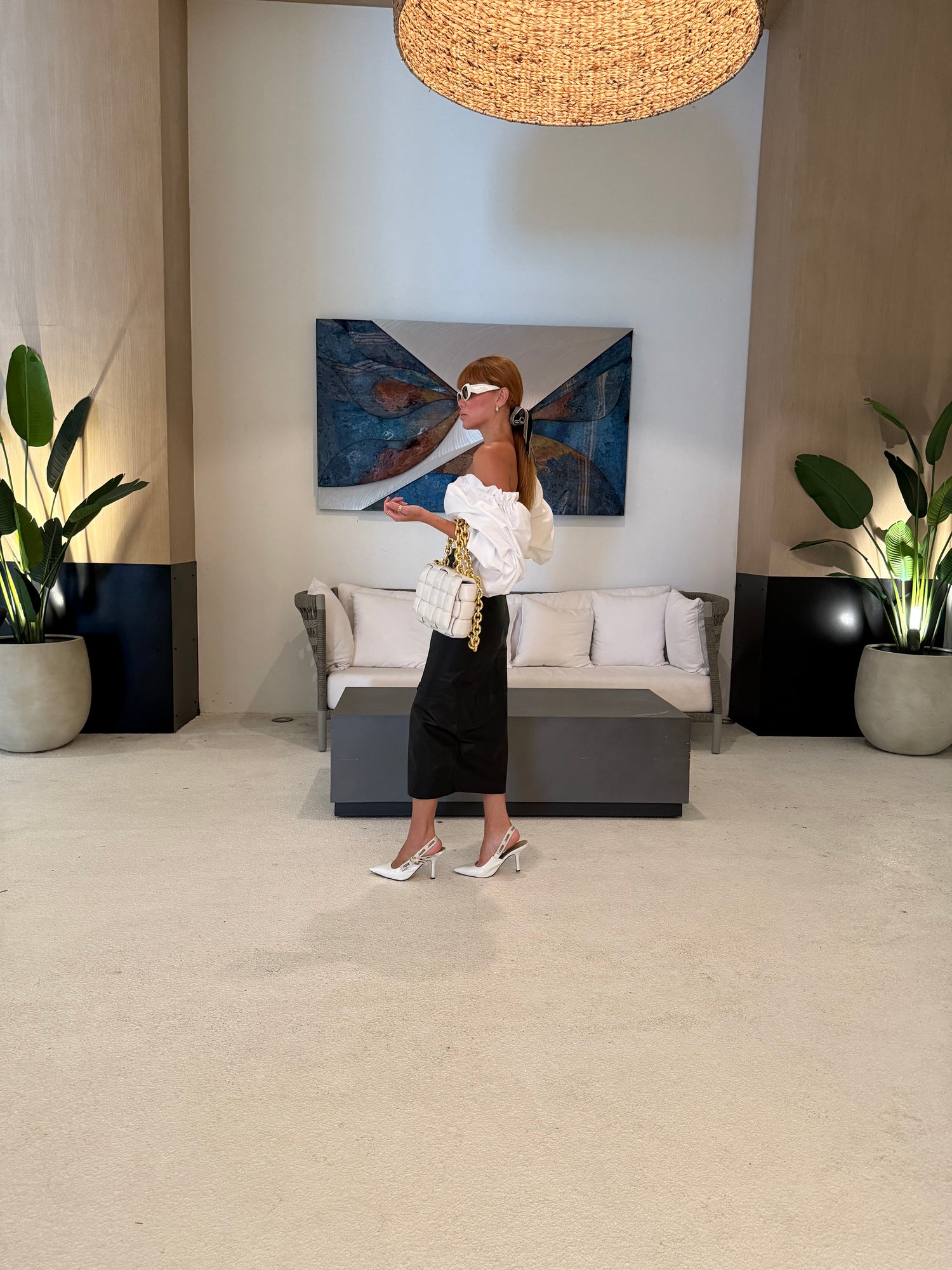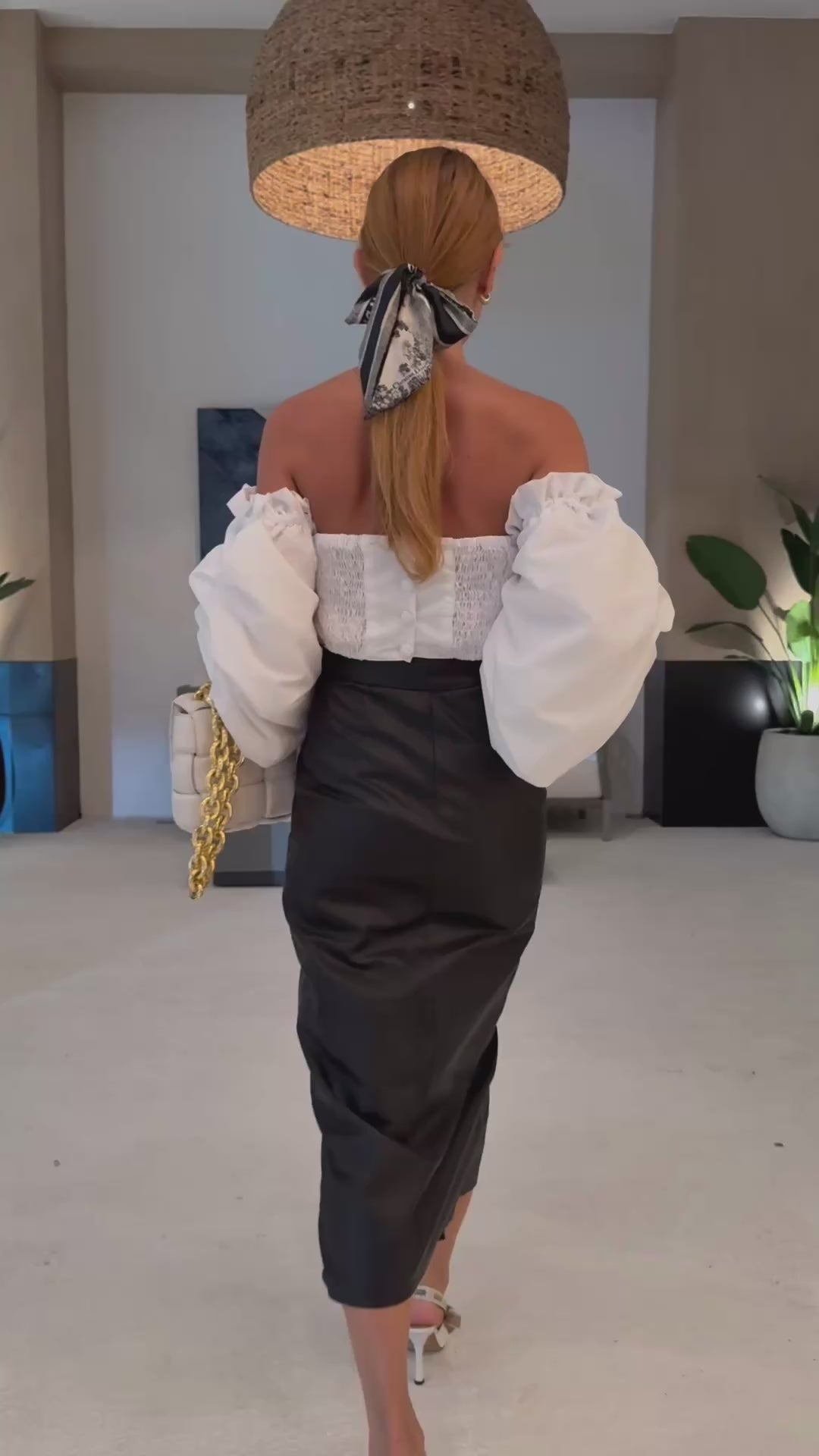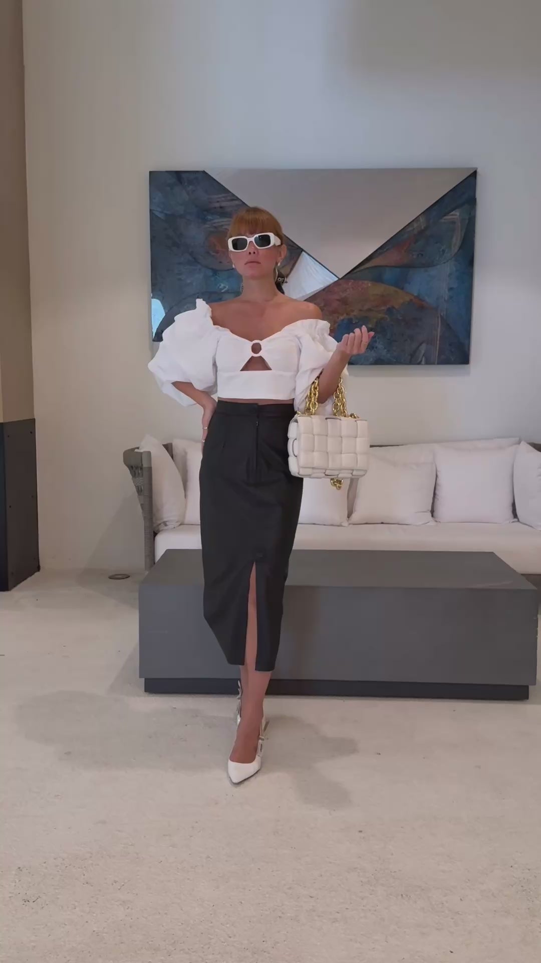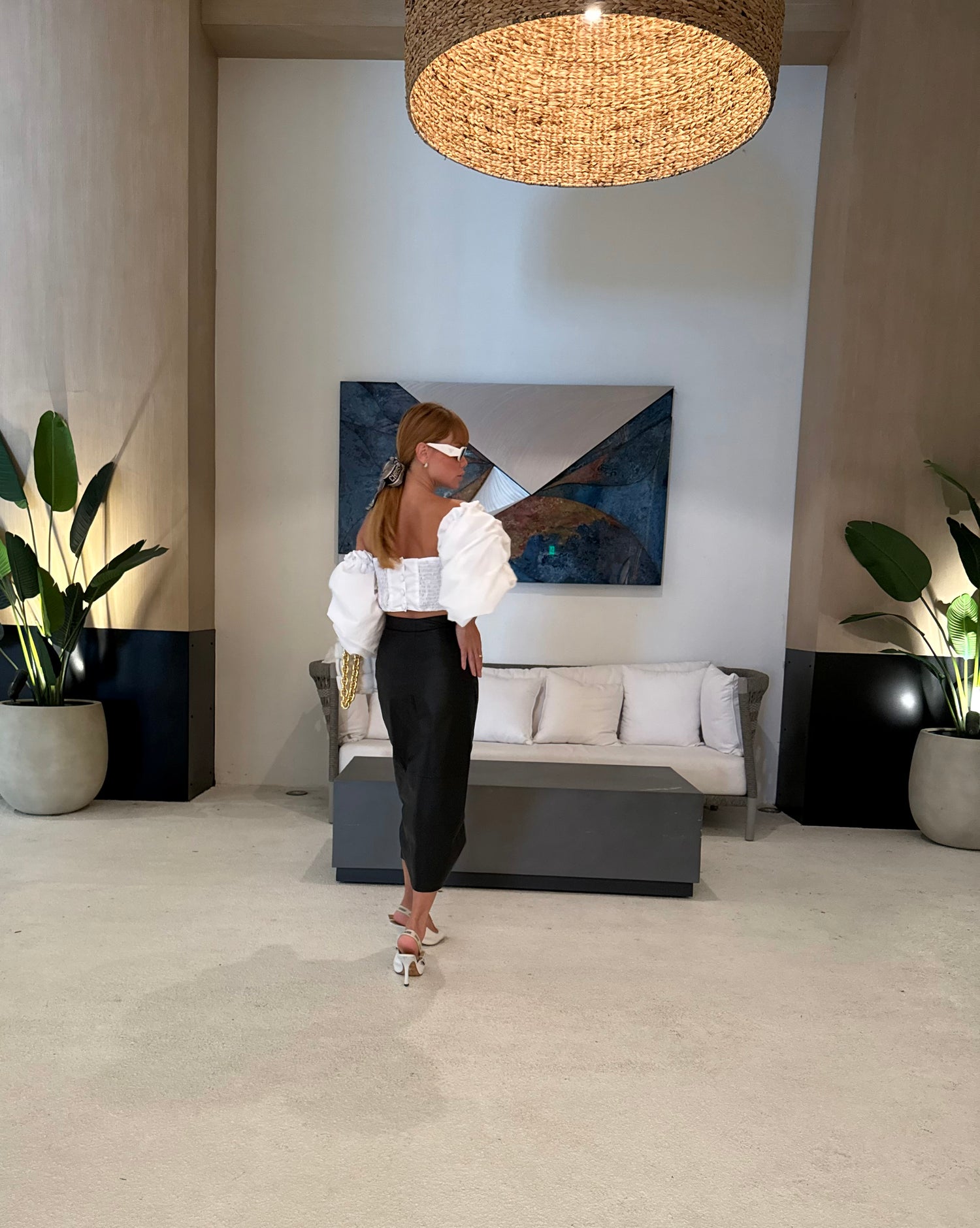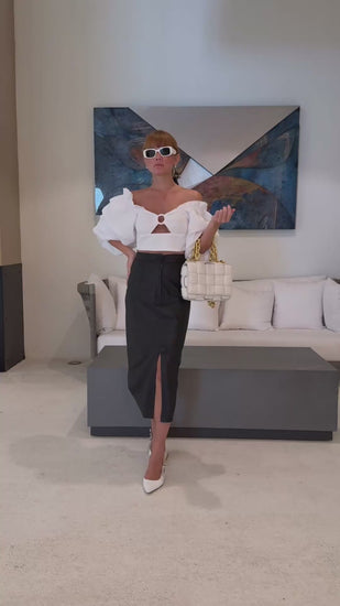 Cropped top with puff sleeves and front ring detail. A piece that combines elegance and bold style. It features a flattering fit with a feminine touch. The puff sleeves add volume and sophistication, while the front ring detail brings a modern and distinctive finish.