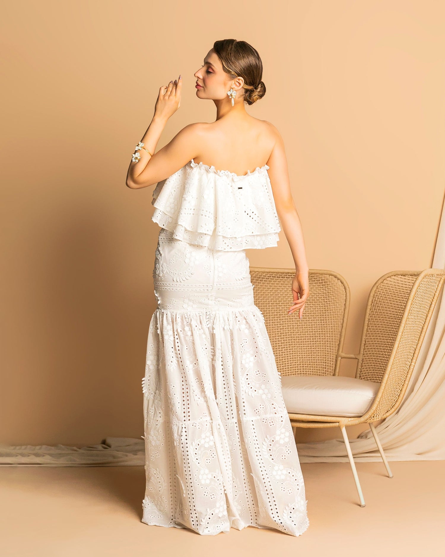 Skirt designed with a shaped silhouette through the hips, softly opening into flowing tiered panels. The design follows the body naturally without feeling tight, creating graceful movement and an elegant drape.