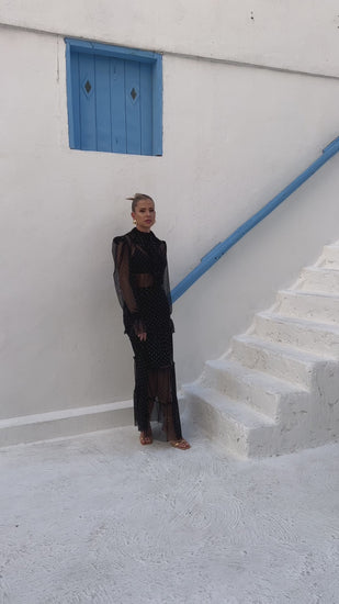 A sophisticated set featuring a blouse with delicate ruffle details on the front, adding a romantic and modern touch to the look. The long skirt complements the outfit, offering elegance and flow. Ideal for special occasions, it balances style and comfort beautifully.