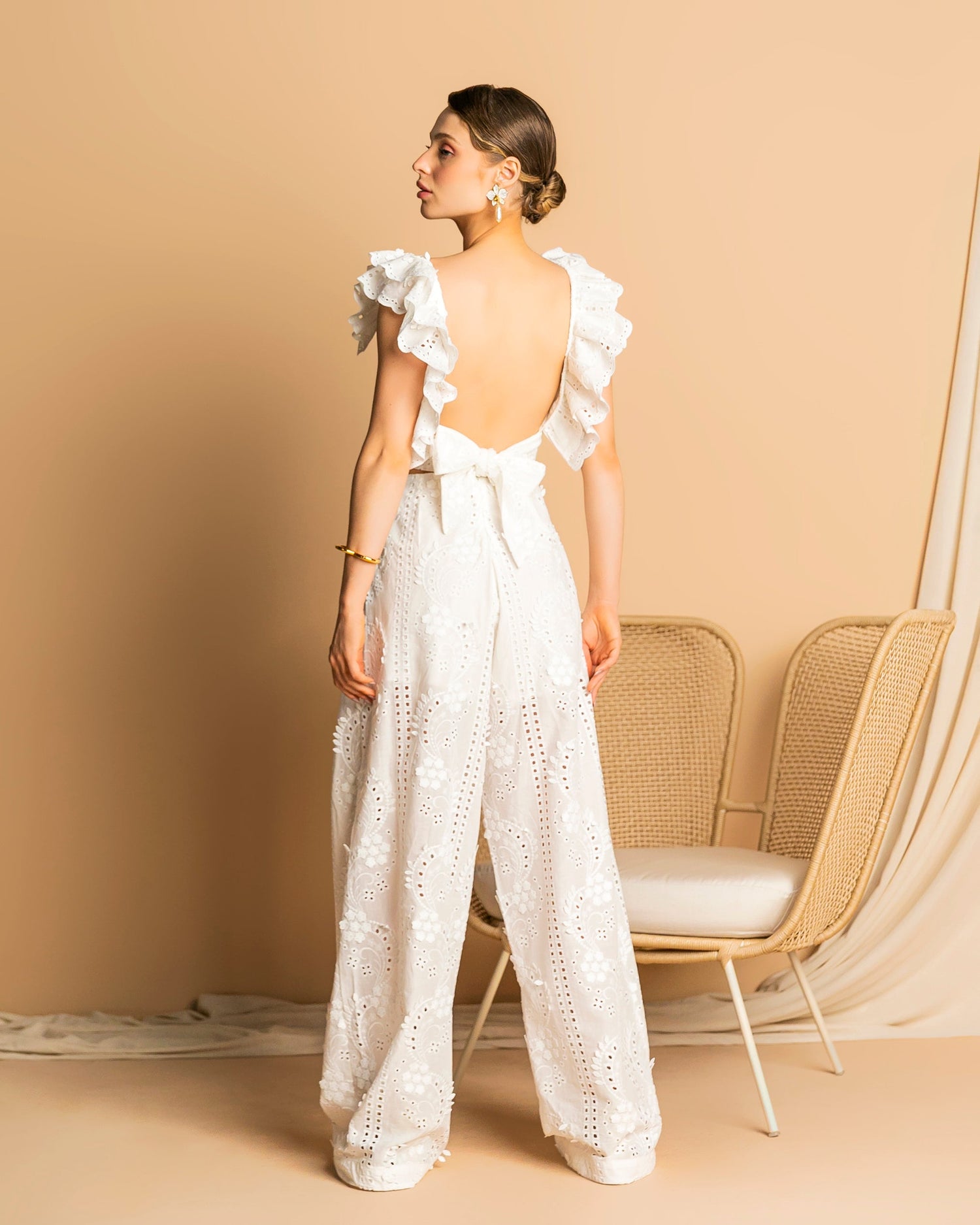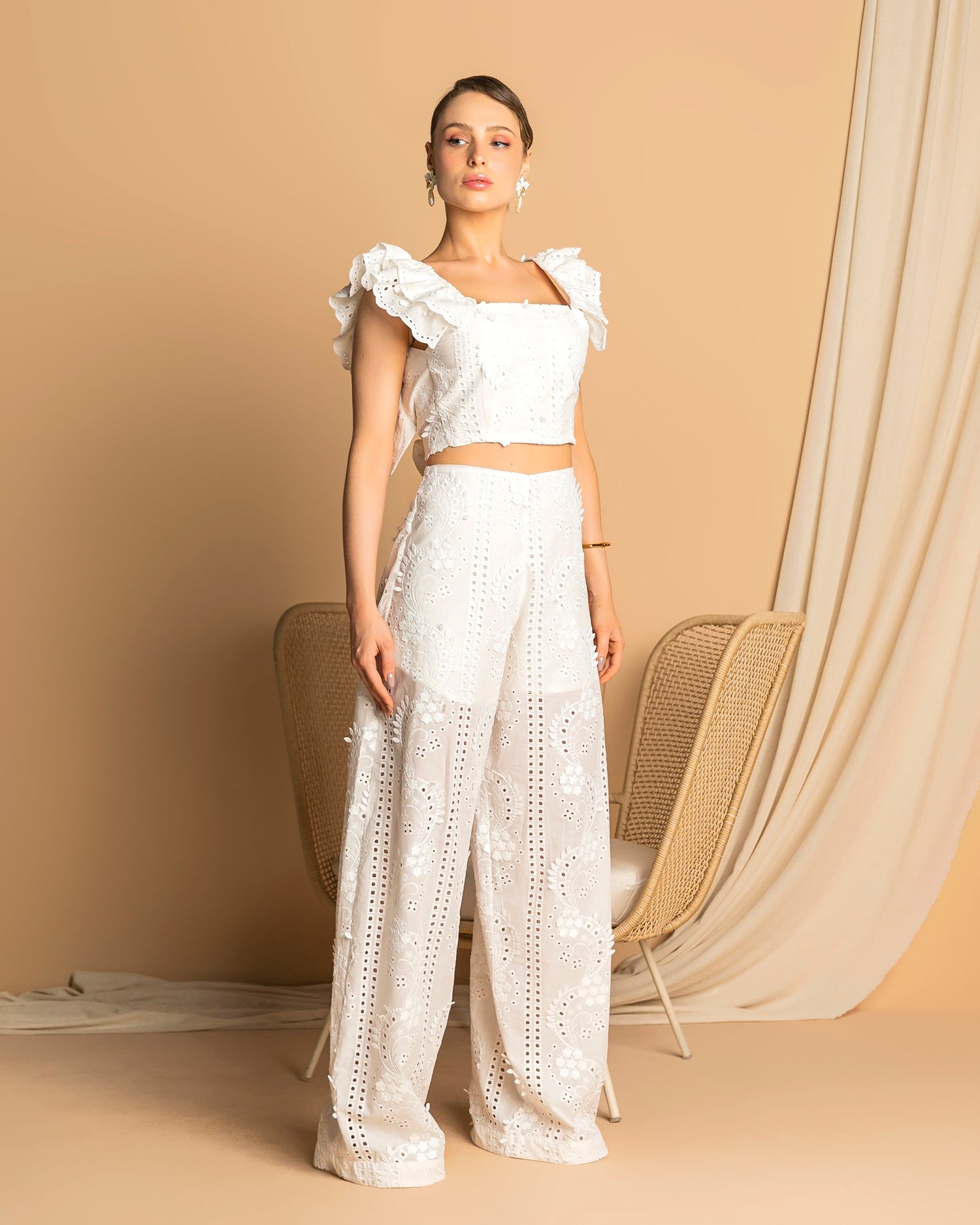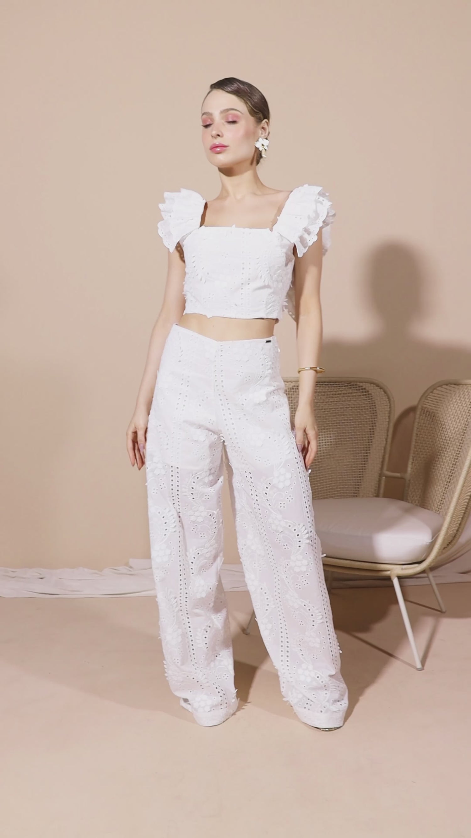 Wide-leg pants crafted from broderie anglaise (laise) cotton, featuring a romantic and delicate aesthetic. The textured fabric adds charm and refinement, while the wide-leg silhouette offers fluid movement and comfort. Compositio:100% Cotton