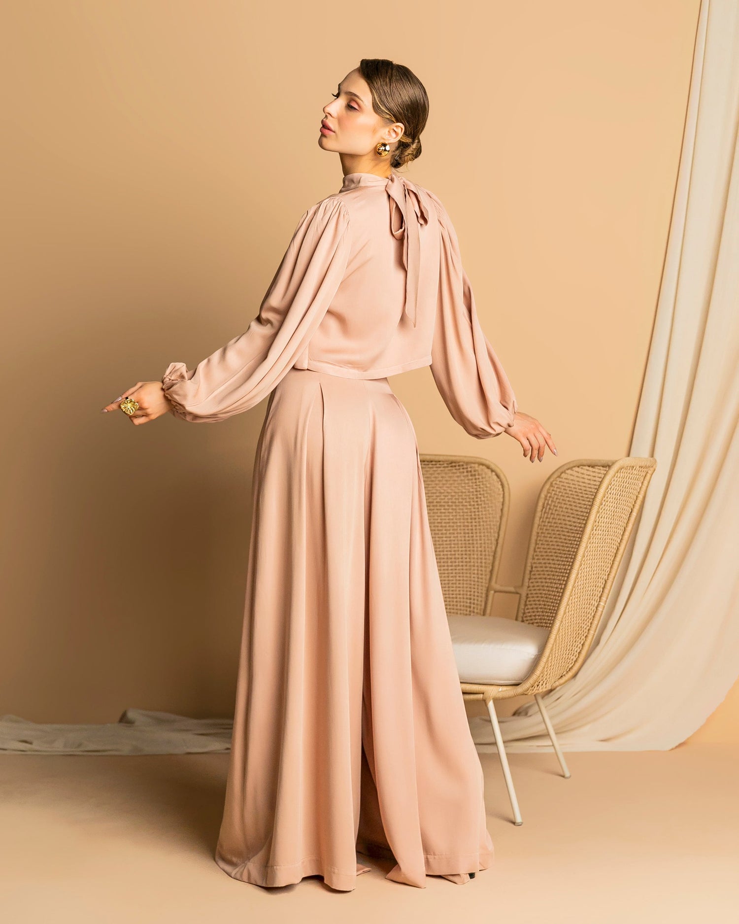 Romantic cropped top with wide, puffed sleeves, high neckline with a bow tie at the back ,and front crossover detail.The combination of voluminous sleeves high neck, and wrap design create a feminine and sophisticated silhouette